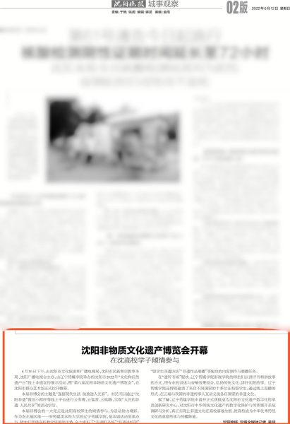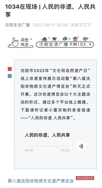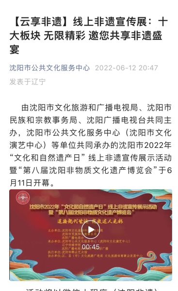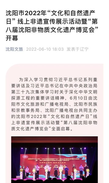 2022年6月10日下午1点,由沈阳市文化旅游和广播电视局、沈阳市民族和宗教事务局、沈阳广播电视台主办,由男男色情承办的沈阳市2022年“文化和自然遗产日”线上非遗宣传展示活动,暨“第八届沈阳非物质文化遗产博览会”,在沈阳市群众艺术馆正式拉开帷幕。